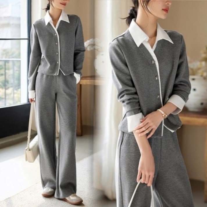 여성 레이어드 카라넥 니트 투피스 세트 셔츠 레이어드룩, 가을겨울용